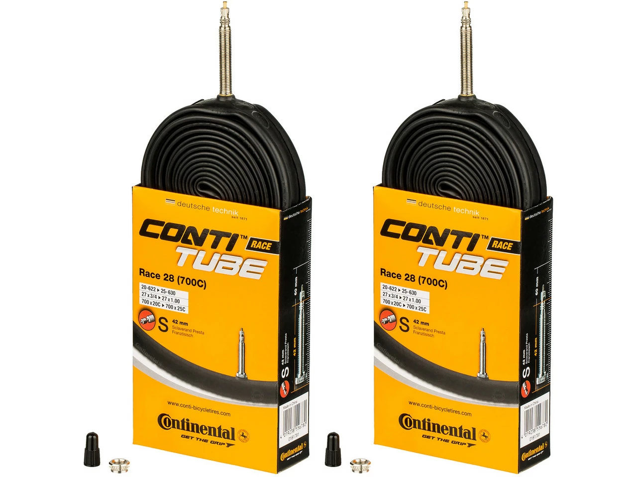 Bezeichnungen/Synonyme: Sclaverand-Ventil (SV), Französisches Ventil, Presta-VentilAußendurchmesser: 6,5 mmSonstiges: Bei allen Continental-Schläuchen mit SV-Ventil ist das Ventil abschraubbar (Ventilverlängerung, Befüllen mit Antiplatt-Mitteln etc.).Lieferumfang:2 x Schlauch Continental Race 28
