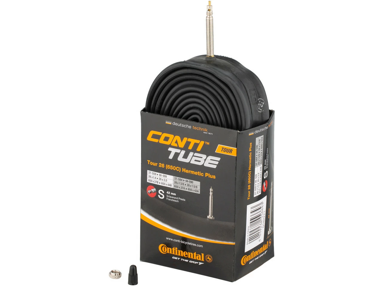 Die verstärkten Tour Hermetic Plus Schläuche von Continental sind besonders stark, luftdicht und halten den eingestellten Luftdruck deutlich länger für selteneres Nachpumpen.