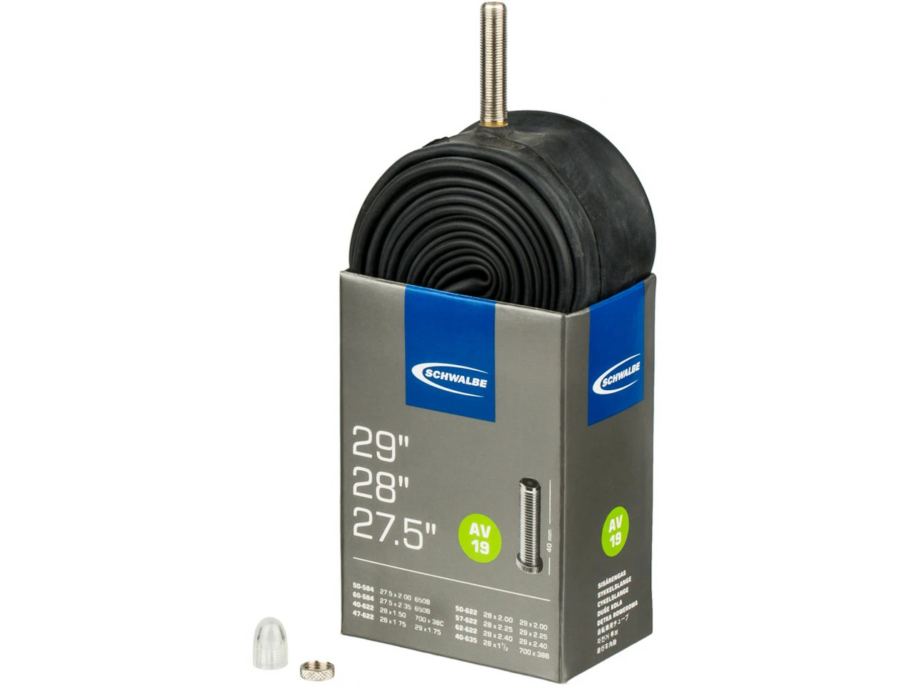 Spezifikationen:Einsatzbereich:Touring & TrekkingETRTO:50-584 bis 40-635Reifendimension:27,5 x 2,0 bis 28 x 1 1/2Schlauchmaterial:ButylVentilart:AV 40 mm, SV 40 mmPassende Dimensionen (ETRTO):27,5 x 2,00 = 650B (50-584)27,5 x 2,35 = 650B (60-584)27,5 x 2,40 = 650B (62-584)28 x 1,50 = 700 x 38C (40-622)28 x 1,75 = 29 x 1,75 (47-622)28 x 2,00 = 29 x 2,00 (50-622)28 x 2,25 = 29 x 2,25 (57-622)28 x 2,40 = 29 x 2,40 (62-622)28 x 1 1/2 = 700 x 38B (40-635)Ausführungen:28×1,5-2,35 AV 40 mm