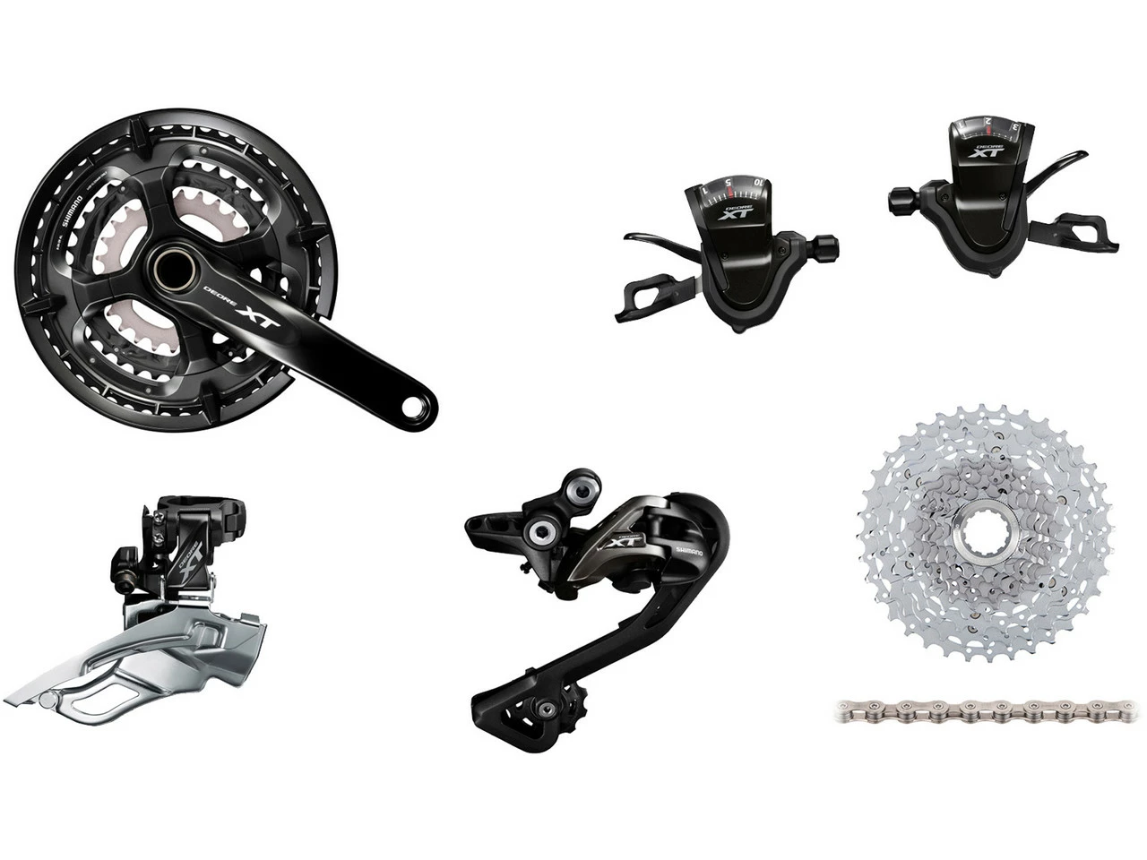 1 x Kurbelgarnitur Shimano XT (FC-T8000)1 x Schaltwerk Shimano XT Shadow (RD-T8000)1 x Umwerfer Shimano XT (FD-T8000)1 Paar Schaltgriffe Shimano XT 3×10 (SL-T8000) mit Ganganzeigen1 x Kassette Shimano XT (CS-M771-10)1 x Kette Shimano XT / XTR / SLX (CN-HG95)1 x Kettenschutzring Shimano1 x Kurbelschraube Shimano1 x Umwerfer-Adapter 28,6 mm1 x Umwerfer-Adapter 31,8 mm2 x Innenzug2 x Außenhülle6 x Endkappe1 x Kassetten-Abschlussring Shimano Aluminium1 x Kettennietstift